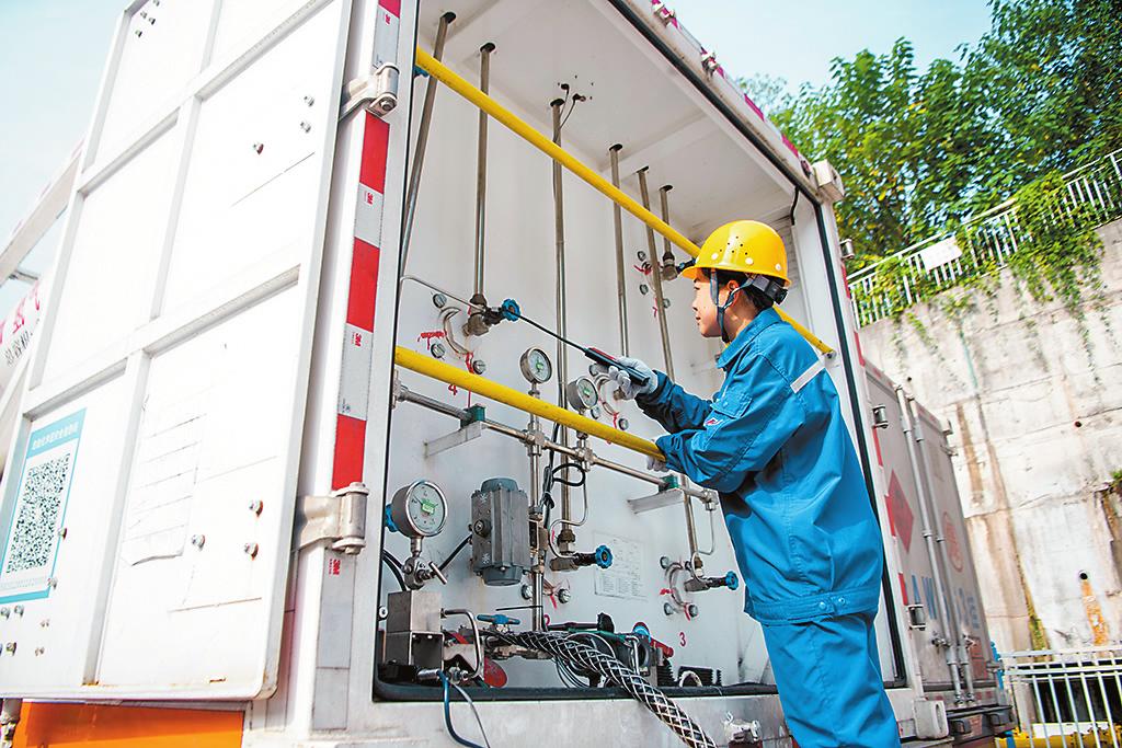 11月26日,综合加能站工作人员在氢燃料管束车氢燃料接卸作业前进行安全检查。位于重庆市九龙坡区龙门阵大道的中国石化半山环道综合加能站是国内首座应用储氢井技术的加氢站,日供氢能力达1000公斤。11月26日,该站对外发布消息称,该站实现安全平稳运行1500余天,累计供应氢气突破400吨,标志着我国在高压地下储氢技术与商业化运营方面取得重要突破。 新华社记者 唐奕 摄(新华社11月26日发)