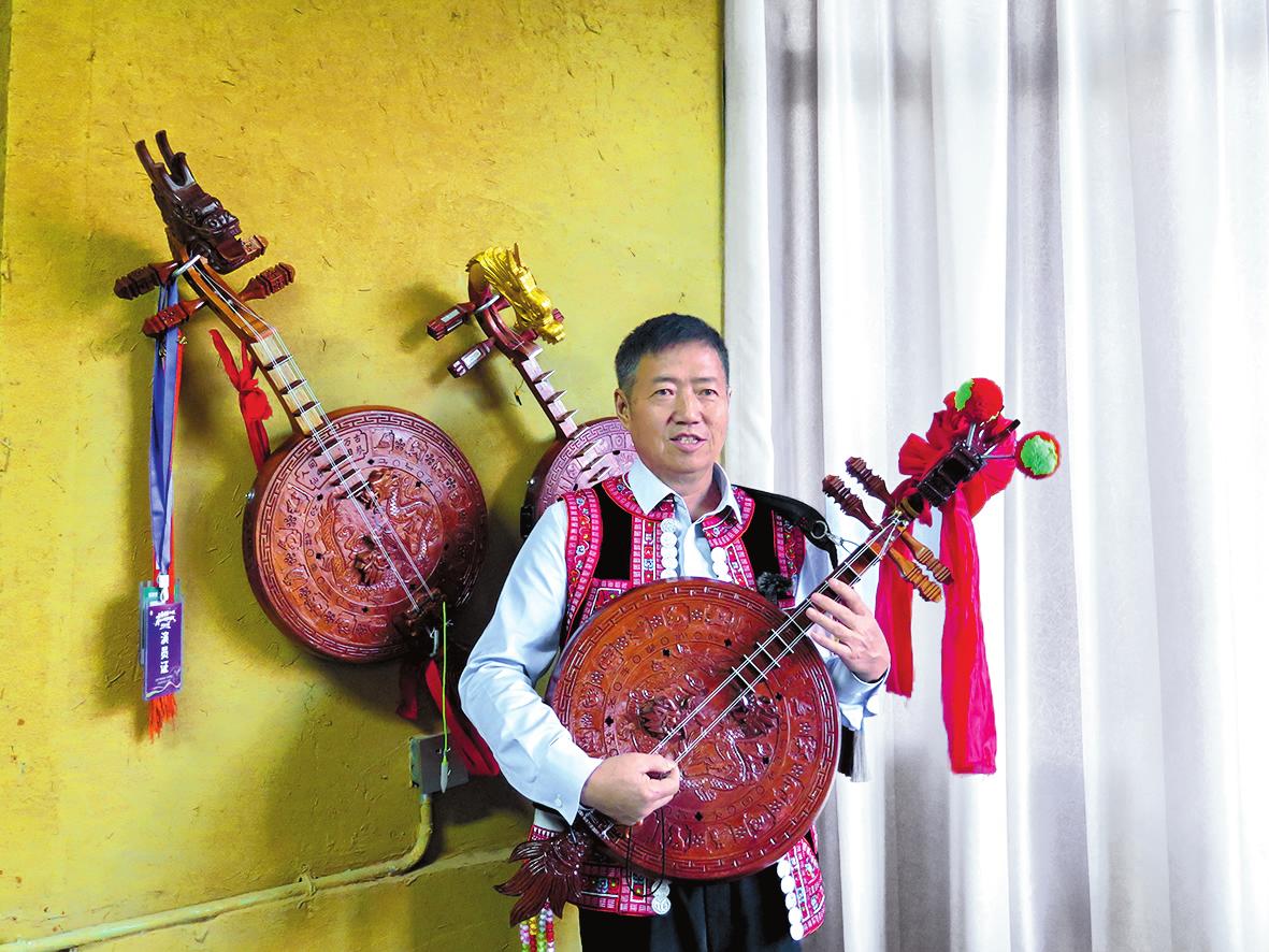 □ 本报记者 饶平 文/图 峨山县的青山绿水间,有一种古老的乐音穿越百年时光依然清脆悦耳——那就是彝族四弦的弦音,承载着彝家人的喜怒哀乐,记录着这片土地的岁月变迁。在嶍峨古镇的花腰彝人街上,有一间典雅别致的峨山四弦传习室,其主人心灵手巧,数十年专心制琴和弹琴,让这一传统乐器焕发出新的生命力——他就是省级非遗四弦琴制作技艺传承人徐宝安。 11月中旬的一个下午,记者走进峨山四弦传习室时,徐宝安正在弹琴,他轻拨琴弦,叮咚一声,带着山野清新气息的调子便响了起来。他垂眼望着琴箱上栩栩如生的“二龙抢宝”,眉头舒展,嘴角勾起浅浅的笑意。这把他亲手雕了半个月的龙头四弦,是他与彝文化结缘半生的注脚。从司法工作者到省级非遗传承人,徐宝安把一把琴弹成了彝族文化的活态遗产。