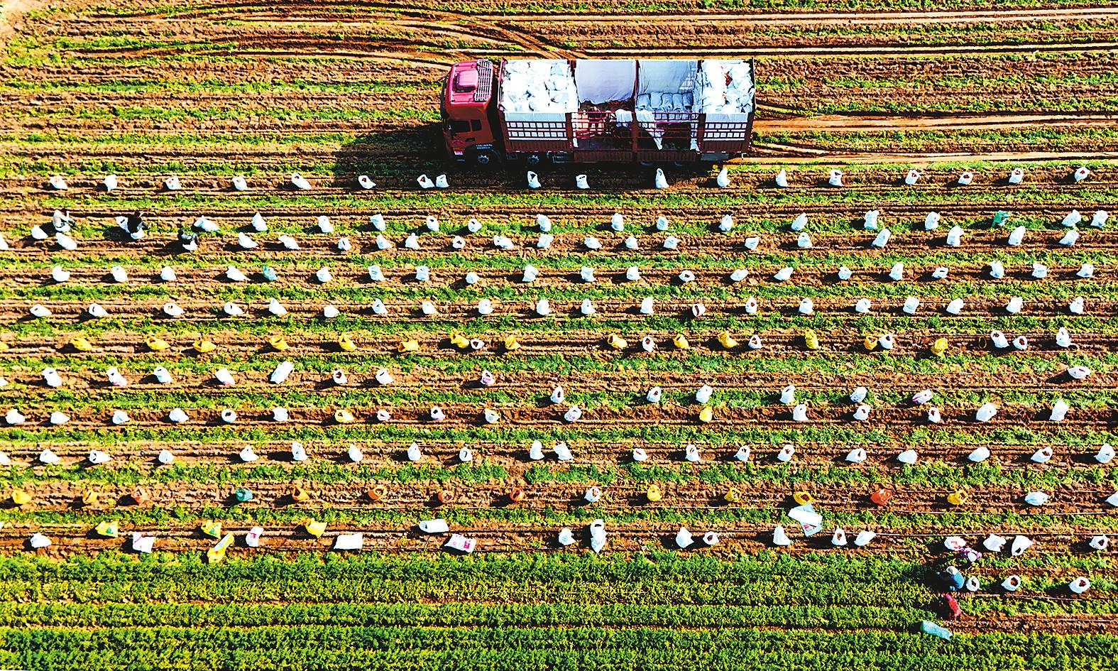 12月7日,河南省开封市尉氏县张市镇张市村特色种植合作社的员工在种植园采收(无人机照片)。