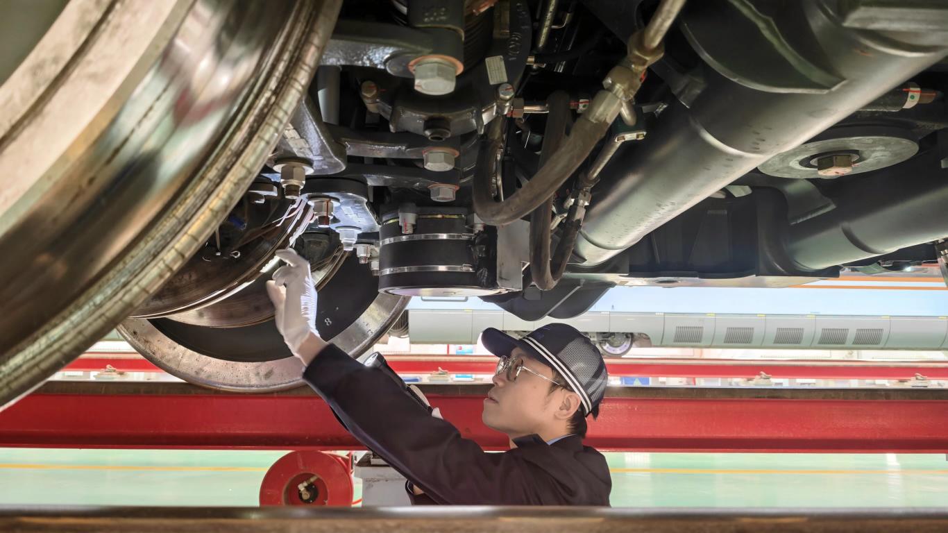 12月21日,中国铁路兰州局集团有限公司兰州车辆段银川动车运用所的工作人员对列车进行检修。他们用专业的坚守,护航每一趟列车的冬日征程,守护万千旅客的平安归途。 新华社记者 邢广利 摄 (新华社12月21日发)