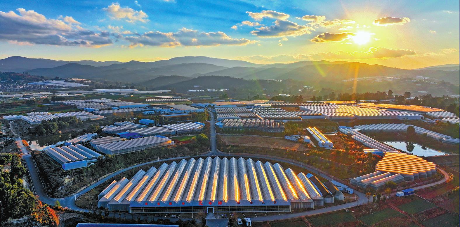 12月21日,江川区九溪镇亚洲花卉科创谷,夕阳下的现代设施农业尽显规模与气势。截至目前,全区设施农业面积达4.9万亩,其中2025年新增6099.61亩。 本报记者 曾永洪 摄