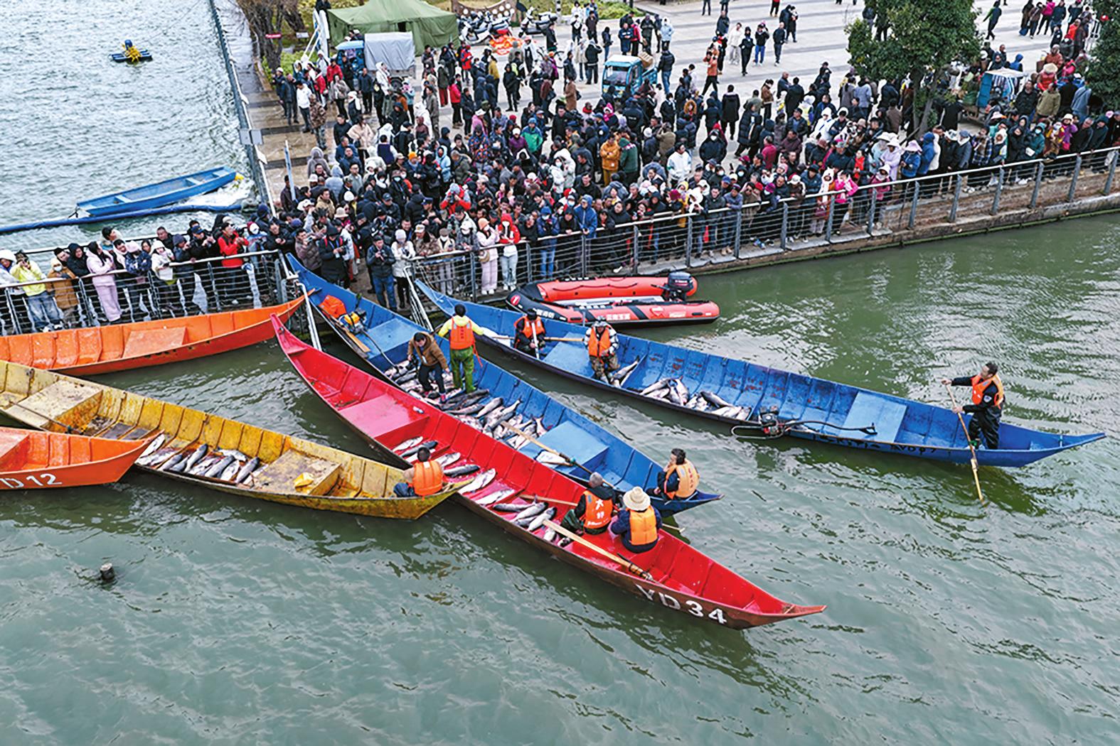 本报讯(记者 白诚颖)封湖近一年后,12月25日,江川星云湖开湖捕鱼。 中午12时,数十条渔船从星云湖边的望海码头出发,迎风驶向湖中撒网捕鱼。放眼望去,湖岸上人头攒动,湖面上海鸥翩飞,渔船你追我赶。市民和游客纷纷掏出手机拍摄,记录星云湖“开海”盛况。 73岁的李奶奶从重庆到玉溪旅居。当天,她和老伴儿约上一同来旅居的10多位伙伴,从玉溪驱车来到星云湖边,体验热气腾腾的捕鱼场景。“玉溪空气优良,街道干净,气候暖和,很好耍,得知星云湖开湖捕鱼,我们就赶来凑个热闹。”李奶奶笑呵呵地说,“一会儿要买点鱼回家煮火锅。” 两小时之后,第一批入湖捕鱼的人陆续上岸,市民和游客对准“主角”一阵狂拍,人群跟随捕鱼队移动。捕鱼队的最前方,两个胖乎乎的孩童用背篓各背一条大鱼,紧跟他们身后的人用竹篮挑着鱼沿长堤往集市赶。此时,当地群众组成的文艺队唱起了歌、跳起了舞,喜悦的人群缓缓流动。 不一会儿,星云湖边的长堤和老河咀鱼市上,各种各样的鲜鱼摊前挤满了人。“新鲜的湖鱼,不好吃不要钱。”随着商户的叫卖声,买鱼者纷至沓来,讨价、还价声不绝于耳。从通海县四街镇赶来的刘文林以184元的价格买了一条大鲢鱼,他欣喜地告诉记者,已约好兄弟姐妹晚上到家里吃饭,一起共享美味。72岁的摄影师杨崇云背着相机一直在拍摄,他特地从昆明赶来,用相机记录出海、捕鱼、收网、热卖的精彩瞬间。 在写着“星云江川,等风,也等你”的长廊前,来自昆明市西山区的王大妈和同伴们用手机拍照和直播。她大方地向记者介绍,他们一行48人来看星云湖开湖捕鱼,享受渔文化之旅,很特别、很开心。 据介绍,从12月25日开湖后,捕鱼将持续到2026年1月10日。 |