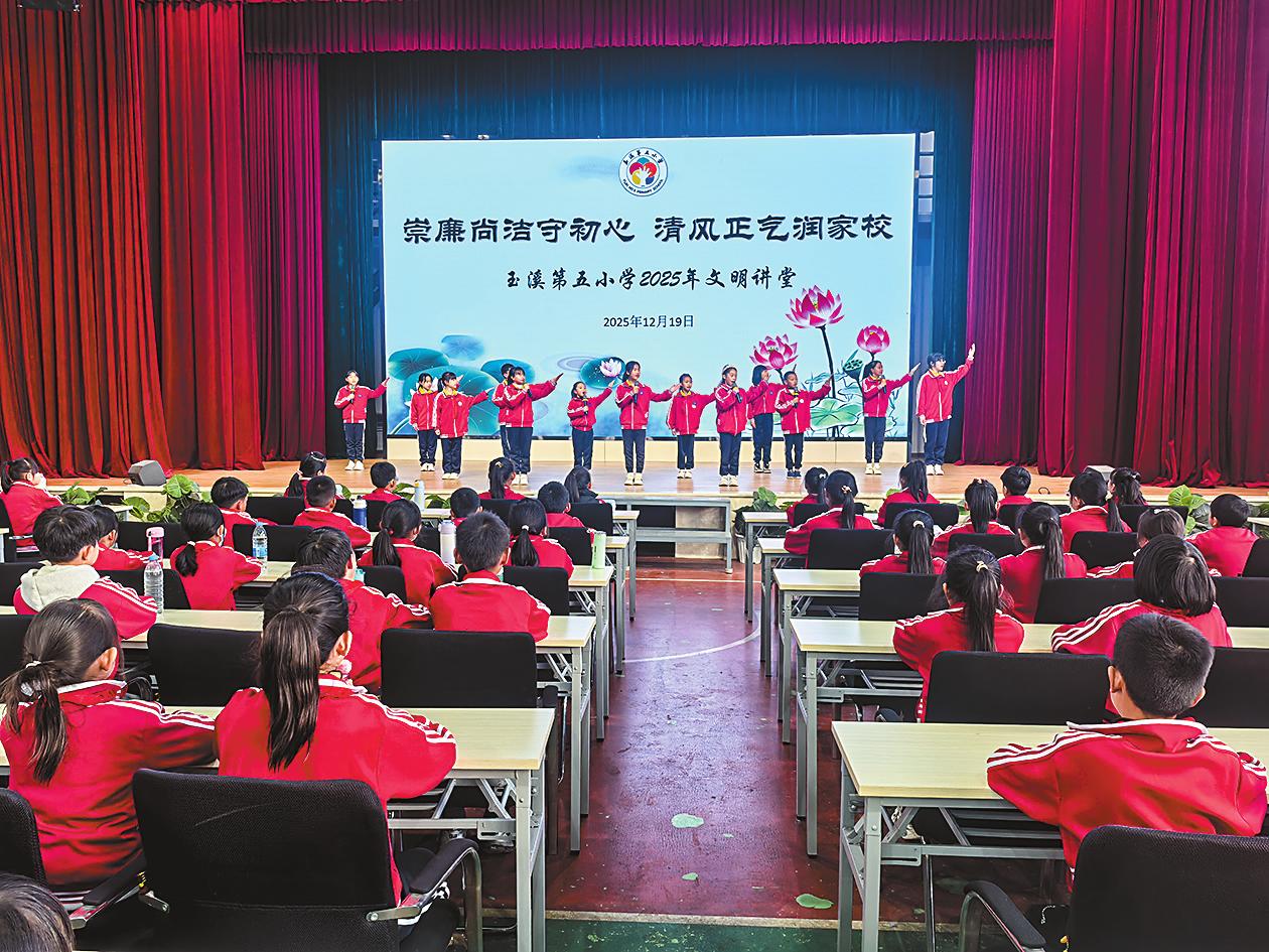 12月19日,玉溪第五小学以“崇廉尚洁守初心 清风正气润家校”为主题,举办2025年文明讲堂,社区工作者、居民代表、党员同志及学校师生共同参与。 活动在一首悠扬的廉洁主题歌曲《碧玉清溪》中拉开帷幕。全体人员通过观看生动的廉洁主题视频,进一步了解廉洁文化的深刻内涵,加深对廉洁精神的理解与认同。紧接着,全体人员共同诵读《岳阳楼记》选段与《石灰吟》,感悟中华经典中蕴藏的廉洁智慧,涵养廉洁品格。 活动现场,四年级(7)班学生施涵媛讲述了周恩来的廉洁故事,一个个感人至深的细节,生动展现了周总理鞠躬尽瘁、清廉如玉的高尚风范。家长代表结合所思所感,积极分享清廉家风故事,传递家庭这个廉洁文化建设重要阵地的责任与力量。学生们还带来了精彩的表演《廉韵润童心 清风伴成长》,表达了对廉洁的理解和向往。 此次活动以多元形式搭建起廉洁文化传播平台,让廉洁理念内化于心、外化于行。学校有关负责人表示,学校将持续携手社区和学生家庭,让清廉之风吹拂家庭、浸润校园、涤荡社区。 (通讯员 张婵娟 吴菲 文/图) |