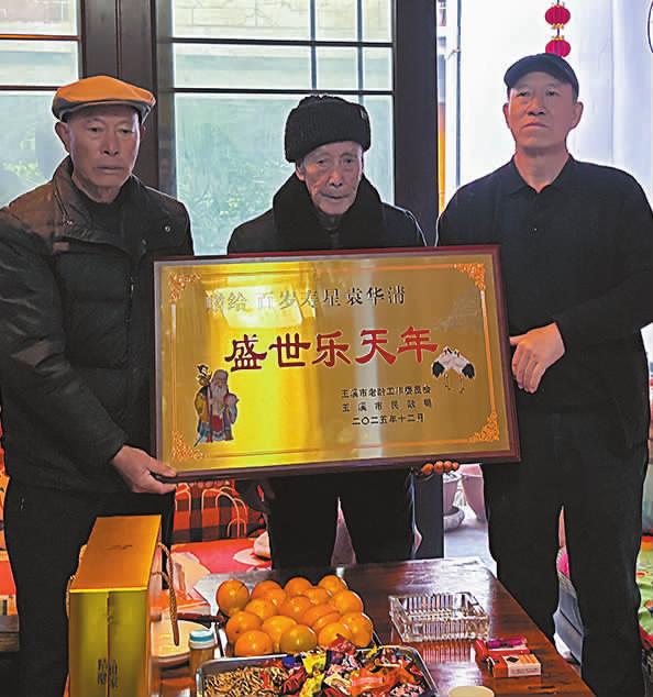 袁华清老人生于1925年12月16日,育有3名子女,如今已是四代同堂,家庭和睦。慰问组为老人送上题有“盛世乐天年”的匾额和1万元慰问金及慰问品,祝愿他健康长寿、乐享天伦。同时,叮嘱家属要悉心陪伴照料老人,让老人在温馨和睦的家庭氛围中安享晚年。