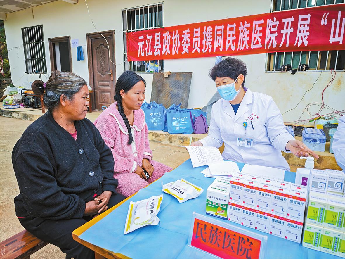 近日,元江县政协联合元江民族医院赴甘庄街道凹腰山村开展免费义诊活动,将优质医疗服务送到群众家门口。活动现场,医疗骨干与政协委员组成服务队,有序为村民进行血压测量、血糖检测、心电图检查及常见病诊疗,并现场收集村民对基层医疗服务的意见建议。 通讯员 方璐 李厚宽 摄