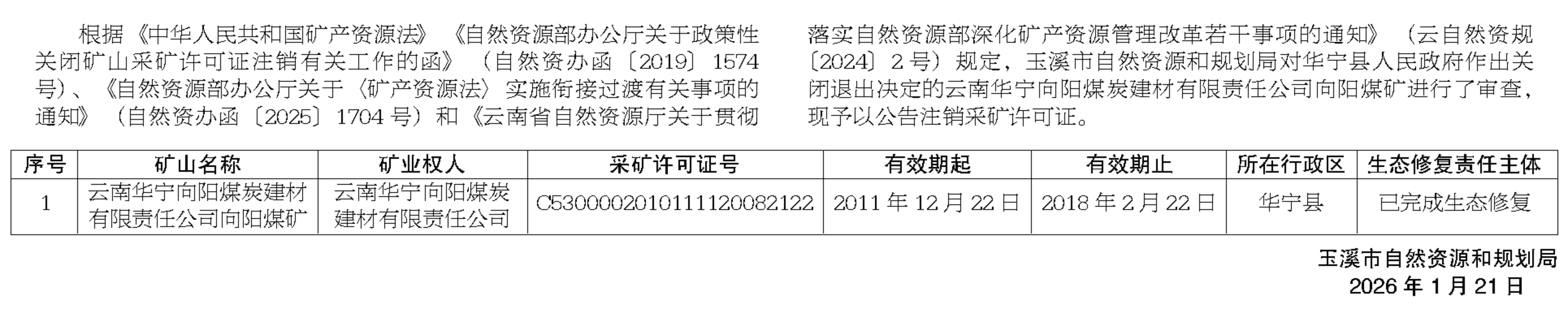 玉溪市自然资源和规划局关于注销云南华宁向阳煤炭建材有限责任公司向阳煤矿采矿许可证的公告