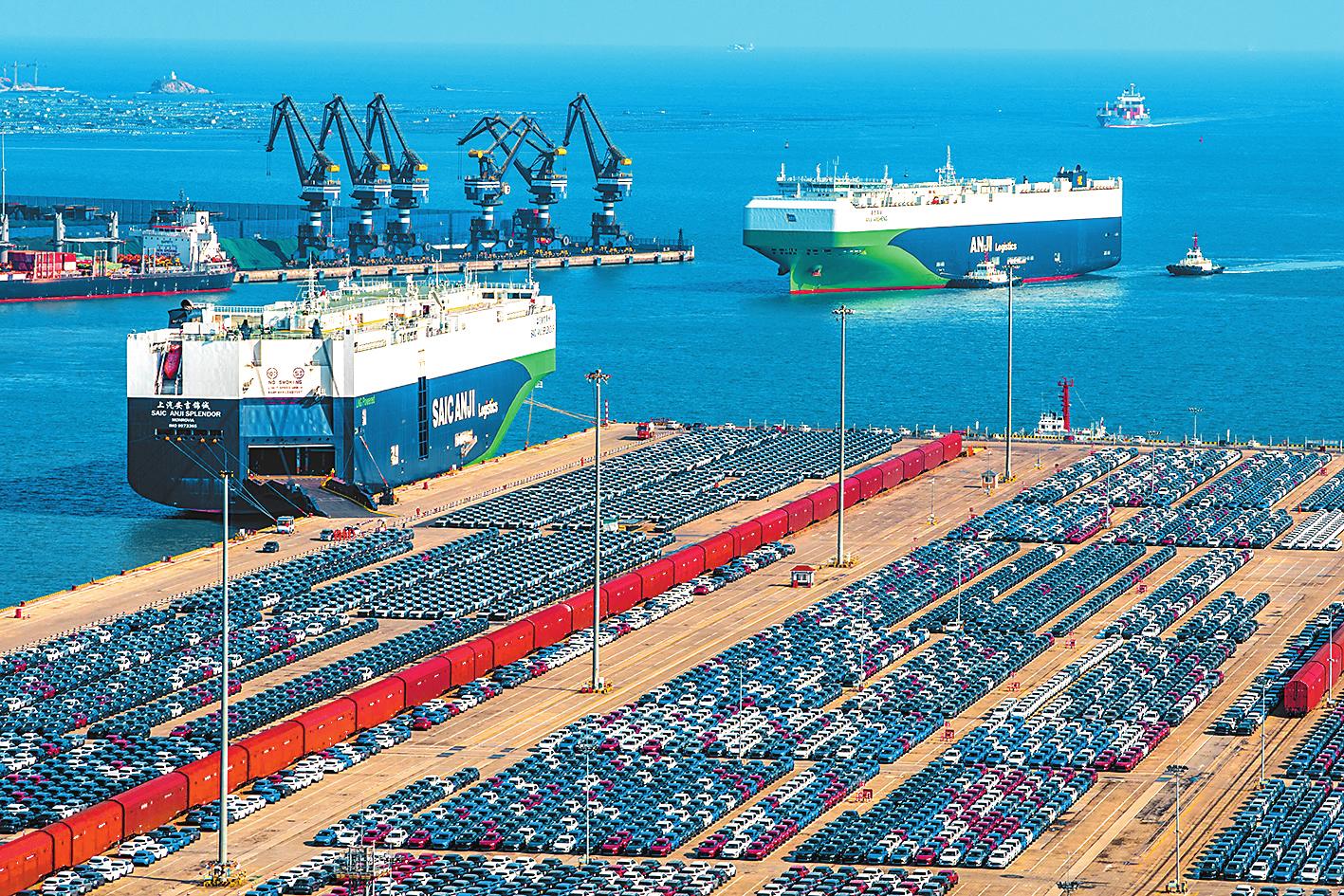 1月27日,在山东港口烟台港,汽车运输船在装载出口商品车(无人机照片)。