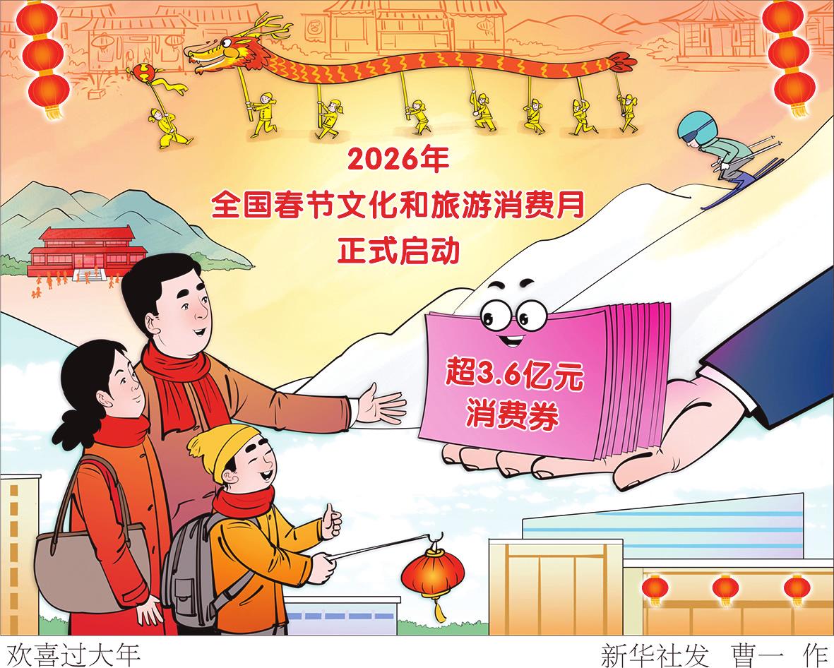 文化和旅游部1月29日在福建省泉州市正式启动2026年全国春节文化和旅游消费月,组织各地围绕春节假期开展文旅消费惠民活动,更好满足人民群众“欢欢喜喜过大年”美好生活需要。 消费月从1月底持续至3月初,其间各地将围绕年俗、演出、展览、冰雪游、避寒游、亲子游等热点,推出丰富多彩的应季文旅产品和活动,举办约3万场次文旅消费活动,发放超3.6亿元消费券等消费补贴,推出门票减免、票根联动优惠、跨区域文旅优惠等举措,加大直达居民游客的普惠政策力度,为人民群众欢度新春提供更多文旅选择。 曹一/作(新华社1月29日发) |