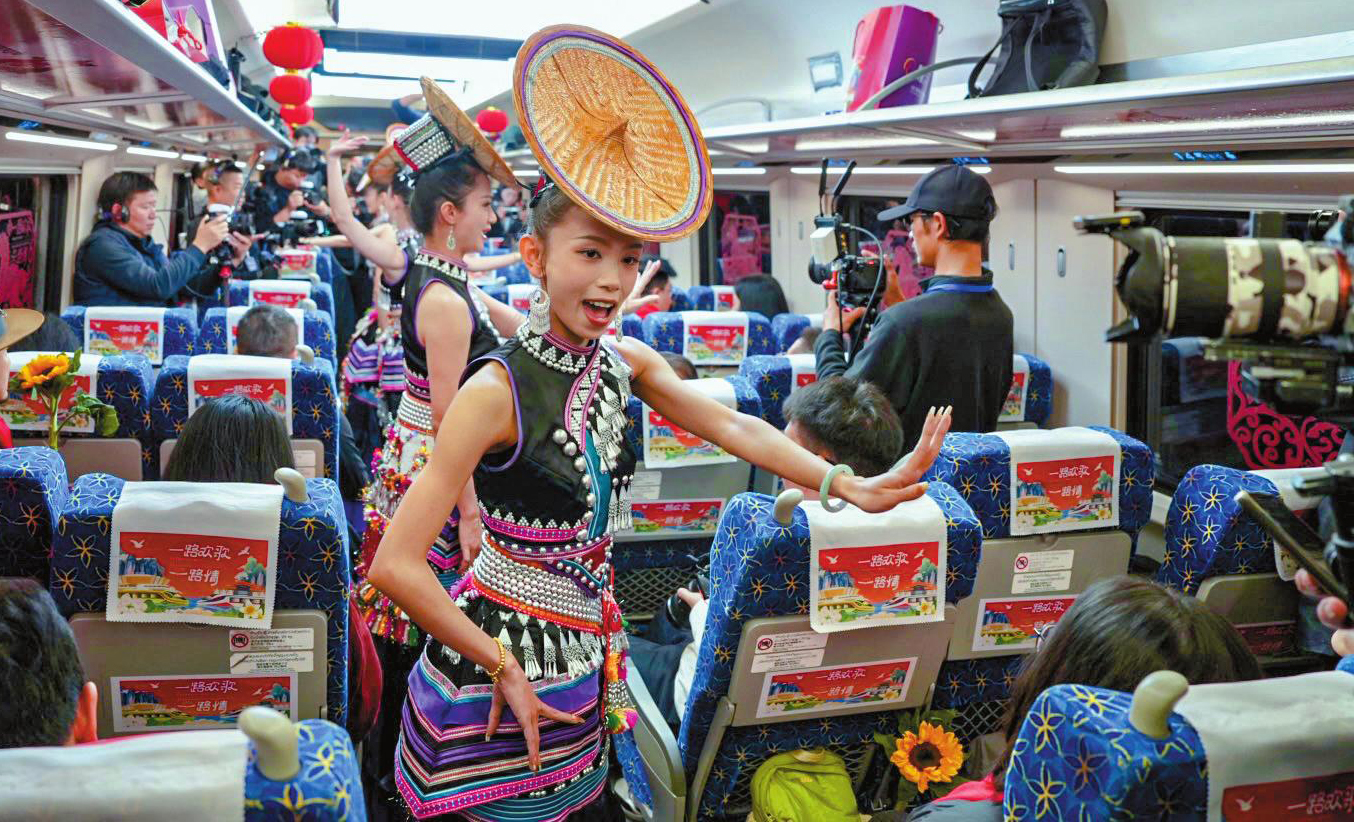 本报讯(记者 李艾丽)2月4日,一场别开生面的“一路欢歌一路情”中老铁路春节文化主题活动在飞驰的列车上举办。玉溪作为中老铁路沿线重要节点城市,精心组织了文艺展演、故事分享和特色伴手礼展示等活动,向中外旅客展示玉溪的文化魅力。 本次活动将D87次“澜沧号”与D88次“复兴号”列车打造成移动舞台,两车分别从昆明南与万象北出发,完成跨越山河、凝聚人心的双向奔赴。活动设计了50余个环节,涵盖文艺展演、民俗体验、故事分享等。4个多小时的行程中,列车车厢化身为流动的“文化客厅”,来自中老两国的艺术团体与各界代表在此共迎新春、共叙友谊。 当D87次“澜沧号”列车驶入玉溪段,玉溪文化盛宴正式开场。随着玉溪形象宣传片的播放,由新平县群众文化工作队带来的花腰傣女子小合唱《喊月亮》率先登场。紧接着,国家级非遗项目峨山彝族花鼓舞《花鼓·花鼓》铿锵亮相,雄浑的鼓点与飞扬的舞步点燃了现场氛围。此外,云南玉昆足球宝贝的啦啦操《滇超加油》、玉溪市花灯剧院的花灯讲唱《铁路情·文明行》、玉溪市滇剧院的唢呐独奏《百鸟朝凤》依次上演,生动展现了玉溪深厚的文化底蕴与昂扬的时代风貌。 演出间隙,“玉溪故事”讲述环节同样精彩。玉溪市文化和旅游局副局长杨建兰以《“滇超”赛事激活城市经济新脉动》为题,介绍了滇超联赛借助中老铁路汇聚八方人气、拉动文旅消费的生动实践,并诚邀国内外游客乘着中老铁路列车来玉溪休闲度假、旅居创业。玉溪职业技术学院国际交流中心主任朱培发分享了玉溪与老挝在技能培训、人文交流等方面的合作成果。 “云南礼物”分享环节,通海豆沫糖、玉溪青花瓦猫、澄江藕粉脆心酥、新平冰糖橙等特色伴手礼惊艳亮相,深受旅客和直播观众喜爱。 峨山县群众文化工作队编导矣媛媛感慨道:“借助跨国平台传递民族风情与祝福意义非凡。”来自甘肃的游客王丽珍表示:“没想到玉溪如此美丽,返程时要专程停留,好好感受玉溪的独特魅力。” 据悉,2026年适逢中老建交65周年,中老铁路也将迎来开通运营五周年。本次活动通过全程直播,向全球观众呈现了一场行进中的文化交流盛会,传递了中老两国之间的深厚情谊。 |