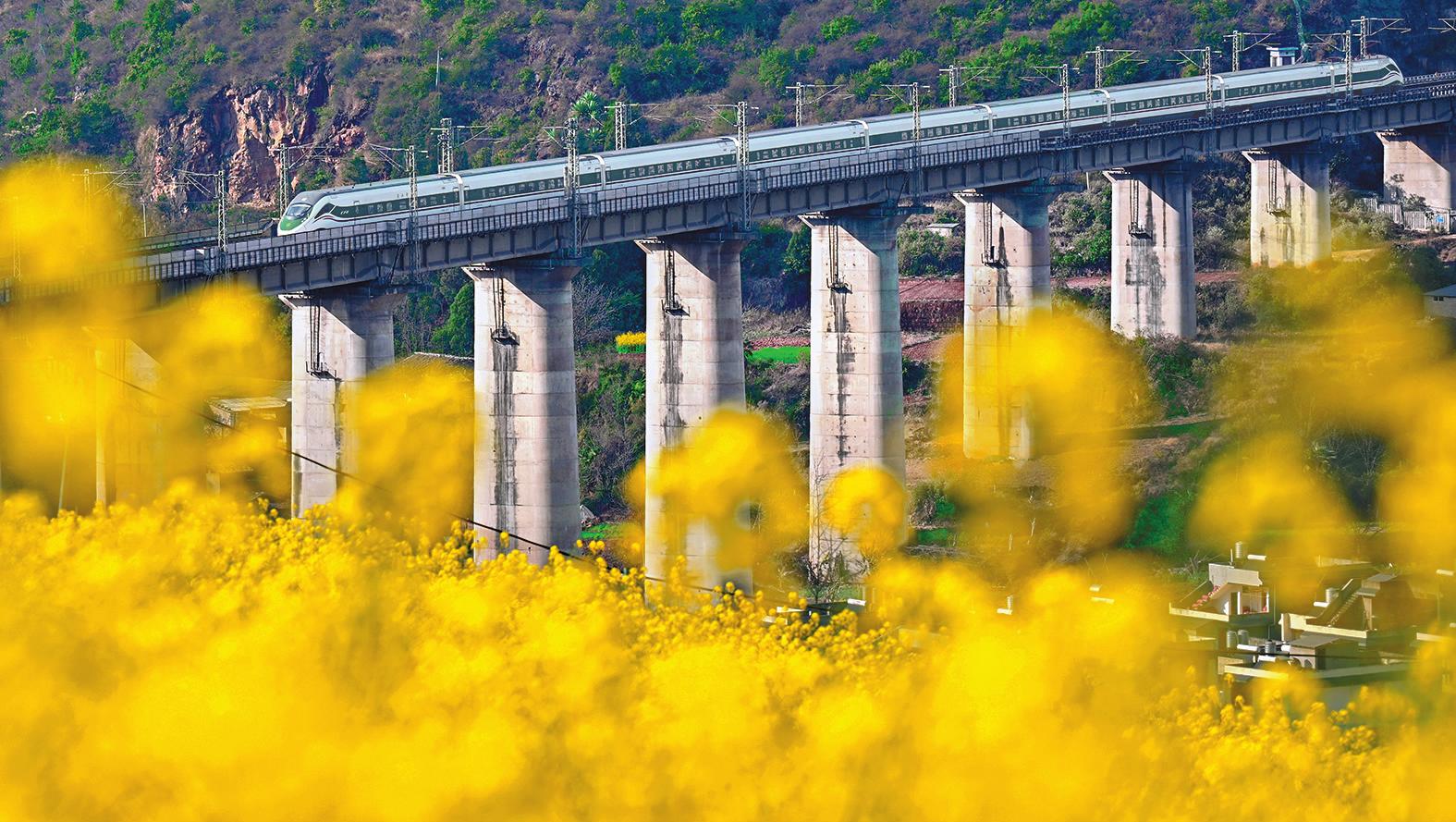 2月5日,“复兴号”列车从红塔区北城街道刺桐关社区油菜花田旁的铁路桥驶过,向着玉溪站飞驰而去。春日的玉溪,中老铁路沿线油菜花肆意盛放,金黄的花海与疾驰的列车相映成趣,勾勒出“人在车中坐,车在画中游”的动人景致,让这段旅程成为一场与春天的浪漫邂逅,构成一幅灵动的春日画卷。
