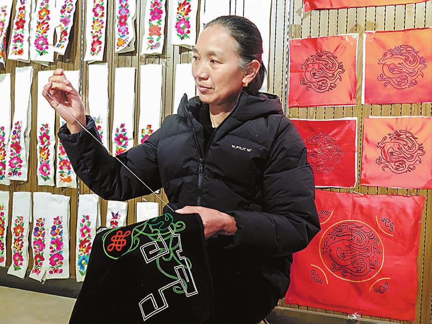 磨砺拿手绝技 李绍萍出生在峨山县富良棚乡一个彝族家庭,祖上五代皆是远近闻名的绣娘,彝绣的基因早已融入她的血脉。年少的李绍萍在放牛、种地的间隙,偷偷观摩姑妈和邻居的刺绣手法,再捡来小块布料,捻起针线,凭着一腔热情慢慢摸索。12岁时,她已能独立绣出自己穿的绣花鞋。彼时山村经济困难,绣品多是腰带、鞋子这类实用物件,正是这日复一日的摸索与实践,让她的刺绣技艺在时光中慢慢沉淀。 母亲龙凤香精湛的绣活成了她黯淡童年里的一束光。“妈妈绣花时,我在旁边边看边拿着小块布料,穿针引线跟着学。”李绍萍说,没有专业老师指导,没有现成图形参考,她便把别人衣服上的花样默默记在心里,回家凭记忆画在布上;见山间马缨花、山茶花盛放,便将自然之美凝于笔尖、绣于布面;祖辈传下的平绣、堆绣技法,她反复琢磨改进,就连彝语名为“额扎嘚”的祖传绣法(正面用一根粗线,背面用两根细线,绣出的作品层次丰富)也被她练得炉火纯青,比老式手法更具时尚感,最终成为她的拿手绝技。