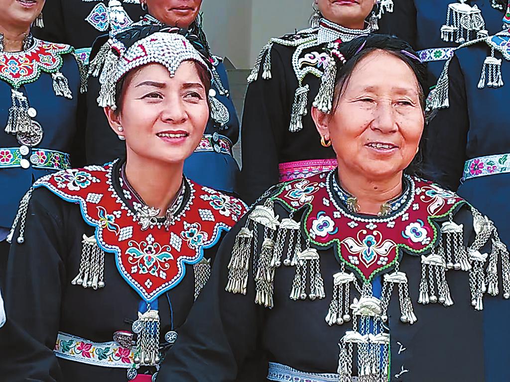穿在身上的“族群史书” 在莫郎的火把节上,身着盛装的彝族妇女是最亮丽的风景线。她们的服饰堪称一部用丝线与银饰书写的“族群史书”,每一处细节都承载着古老的文化密码。 女性服饰以靛蓝土布为底,最醒目的是胸前喜鹊尾形的刺绣胸襟。大红底布上,用蓝、绿、粉三色丝线绣满蝴蝶、花卉纹样,边缘嵌着一圈圆润的白色珍珠,下方垂着层层叠叠的银饰挂片,游鱼和飞鸟的造型暗含“鱼跃龙门”“百鸟朝凤”的美好寓意。头帕上缀满的珍珠、银泡,以及顶端插着的羽毛,象征着她们对山林、祖先的敬畏。老年妇女的彩虹条纹内衬衣袖,更是莫郎彝族聂苏支系独有的标志。 这些服饰均为女性手工缝制,从纺线、织布、染色到刺绣,往往需要耗费数月时间。在莫郎村的祭祀中,盛装不仅是对祖先的敬意,更是对族群身份的认同。银饰的叮当声、刺绣的斑斓色彩与土布的厚重质感交织在一起,让每一位舞者都成为行走的文化符号。
